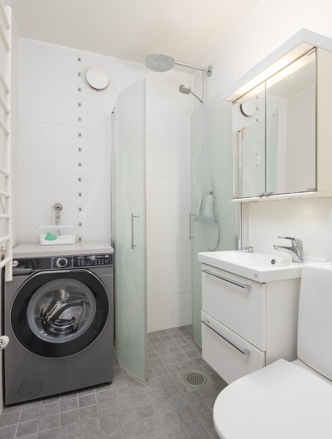 - Varustus: Suihku, Suihkuseinä, Wc istuin, Pesukoneliitäntä, Hana, Allas, Peilikaappi, Allaskaapisto, Bidee-suihku, Lattialämmitys, Pyyhekuivain vesikiertoinen Seinämateriaali: Laatta Lattiamateriaali: Laatta