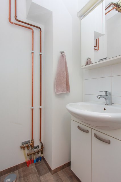 - Vanha erillinen wc, jossa ei ole wc-istuinta. Varustuksena pesuallas, allaskaappi ja peilikaappi. Lattia laattaa (v. 2025) ja seinät maalattu.