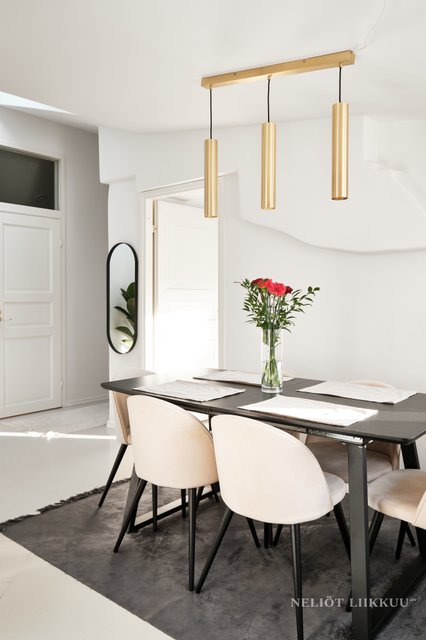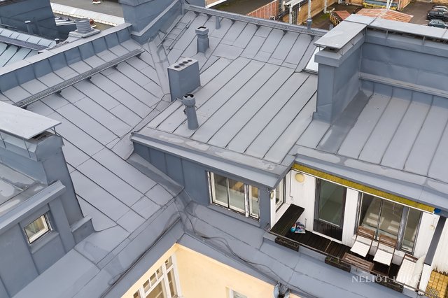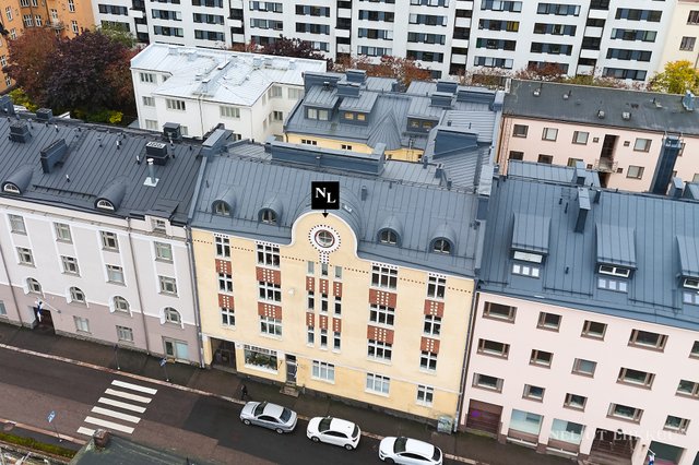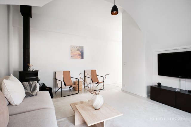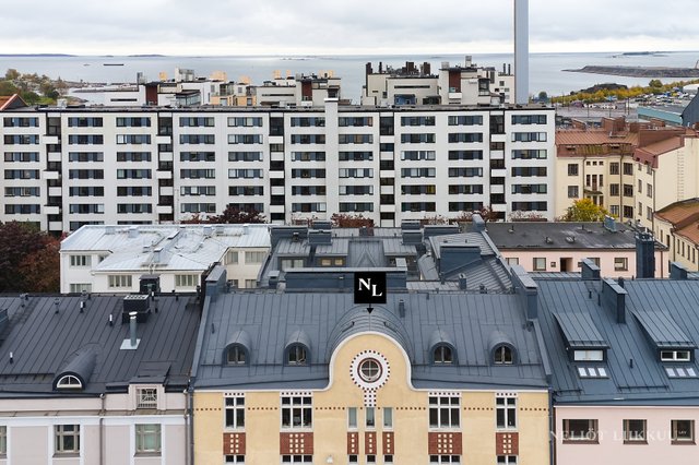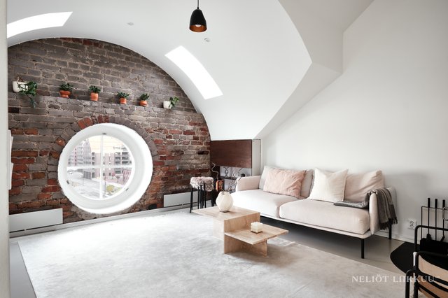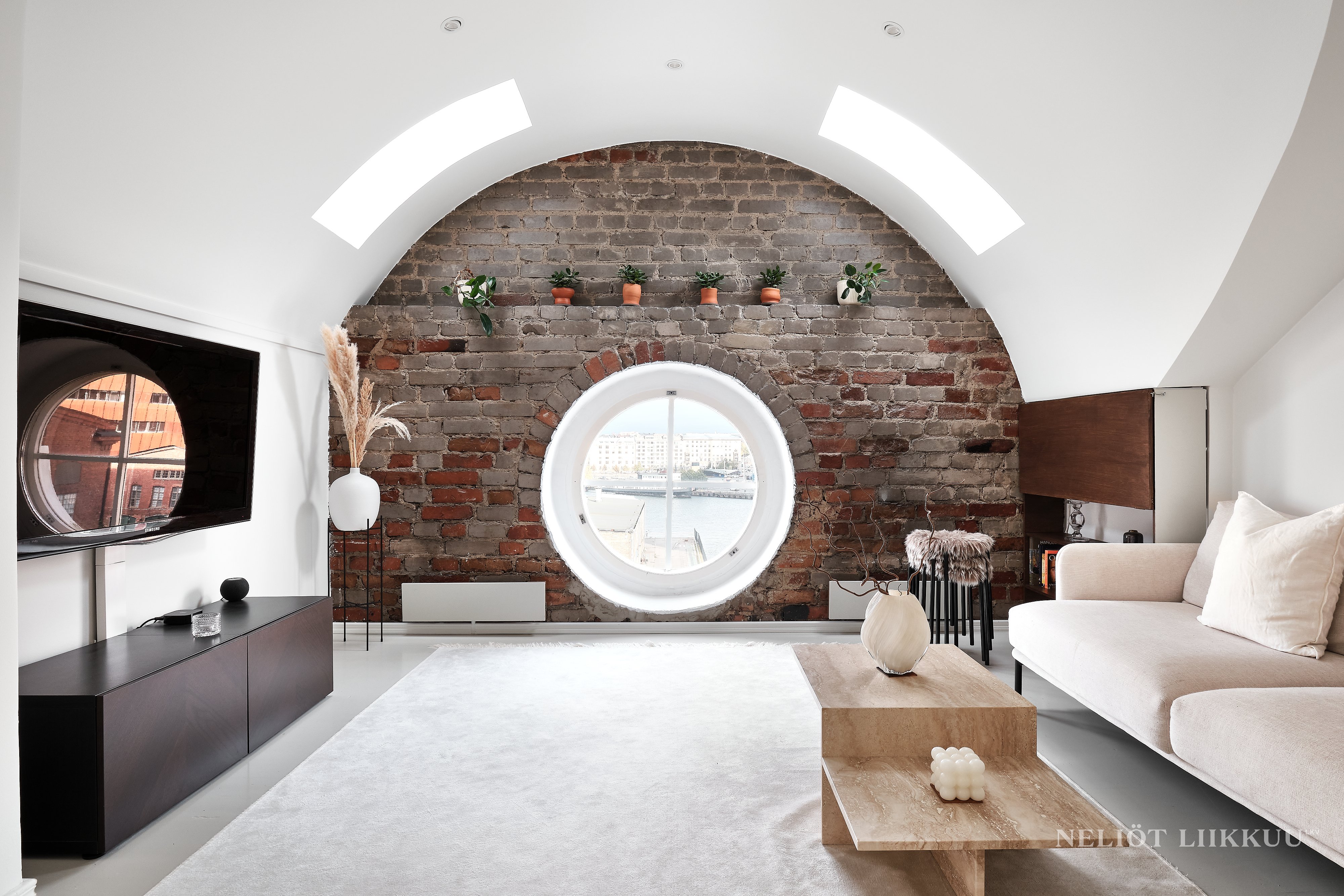 Rakennuksen ylimmässä kerroksessa sijaitseva koti tarjoaa harvinaista asumisen laatua ja on muuttovalmis ilman remonttihuolia. Kokonaisvaltaisesti remontoitu asunto on suunniteltu rakkaudella jokaista yksityiskohtaa myöten. Olohuoneen rouhea tiiliseinä, merelle avautuva pyöreä ikkuna ja kolmen avattavan kattoikkunan tuoma valo luovat kodikkaan ja ilmavan tunnelman. Moderni keittiö integroiduilla laitteilla varustettuna sekä ylellinen kylpyhuone ammeineen tarjoavat arkeen ripauksen luksusta.
