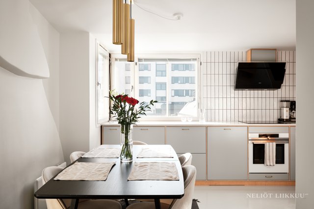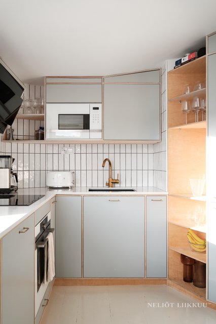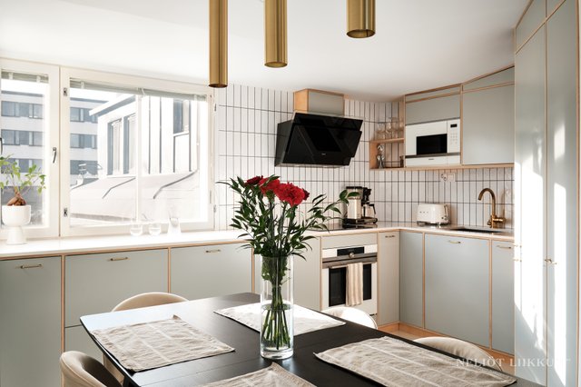 - Vuonna 2019 uusitussa keittiössä Siemensin kalustepeitteiset jääkaappi-pakastin ja astianpesukone, integroitu mikro, induktioliesitaso, erillisuuni, Savon liesituuletin omalla huippuimurilla (toimien osana asunnon ilmanvaihtoa, ABL laatat välitilassa, Granitop kvartsikomposiittitasot, Tapwell hana, Blanco allas, tasossa twist-pistoke ja välitilan valaistus upotetuilla led-valoilla. Avattava kattoikkuna keittiön ja olohuoneen välisellä käytävällä.