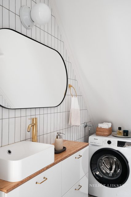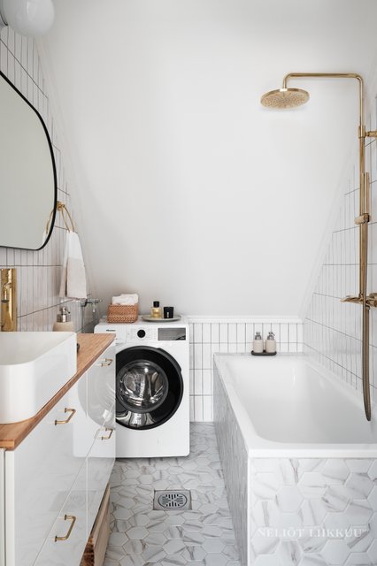 - Vuonna 2019 uusitussa kylpyhuoneessa sadesuihku, Gustafsberg amme, wc, peili, allaslaatikosto, pesukoneliitäntä, sähköinen lattialämmitys ja mahdollisuus bideesuihkuun. Ilmanvaihto omalla huippuimurilla. Lattia ja seinät laatta (ABL)