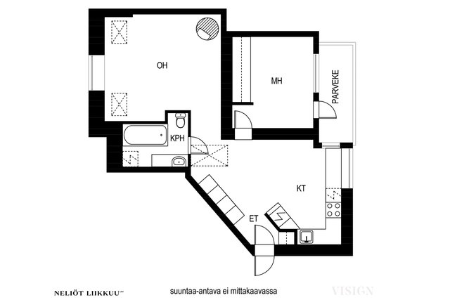 - Huoneistolla on lisäneliöitä, joita ei lasketa asuinneliöiksi (alle 160 cm tilaa).