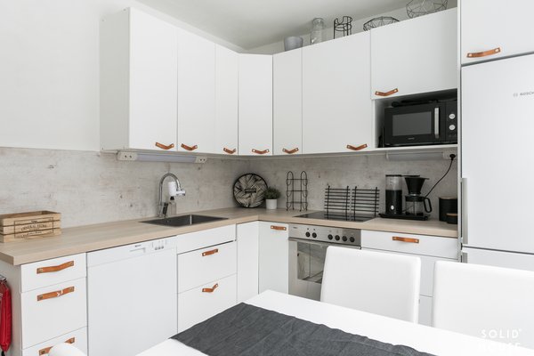 - Uusittu 2019. Valkoiset kaapistot. Laminaattitasot. Välitila betonijäljitelmälevyä. Varustuksena Bosch kodinkoneet: jääkaappipakastin, keittotaso, kalusteuuni sekä Gram astianpesukone. Paikkavaraus mikroaaltouunille.