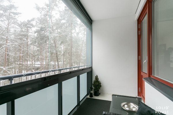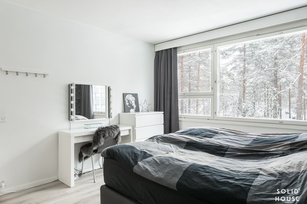 - Keittio ja iso makuuhuone yhtiön sisäpihalle (koilinen). Olohuone, parveke ja toinen makuuhuone kaupungin puistoon päin (lounas)