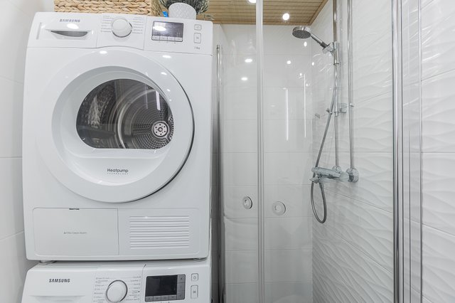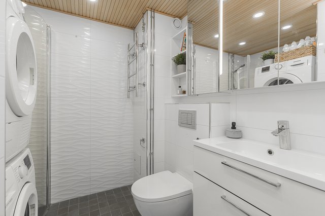- Lattialämmitys, suihku, suihkuseinä 2 kpl, peilikaappi, seinä wc, allaskaappi, bidee, pesukoneliitäntä, pyyhekuivain.