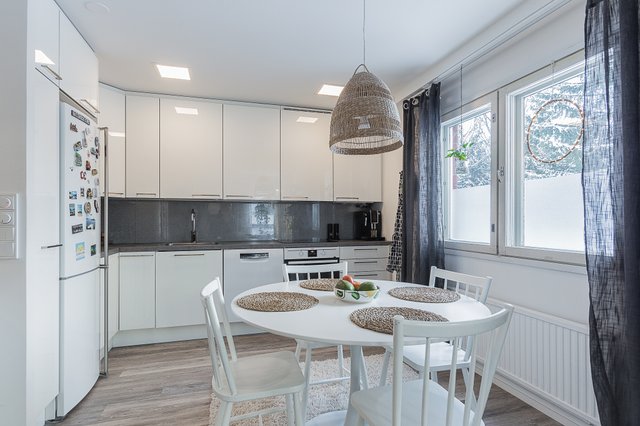 - Kaapistot, tasot, jääkaappi/pakastin, induktio liesitaso, erillisuuni, liesituuletin, integroitu mikro, astianpesukone. Välitila: Lasi.