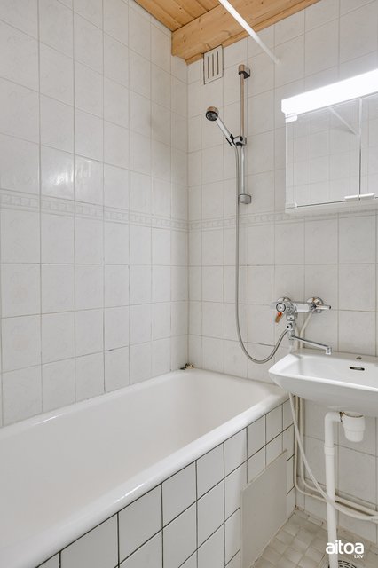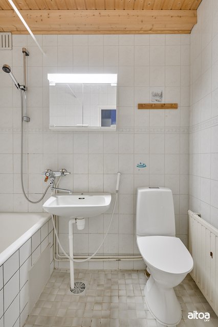 - Suihku, kylpyamme, pesukoneliitäntä, wc-istuin, pesuallas, bidee-suihku, ja peilikaappi