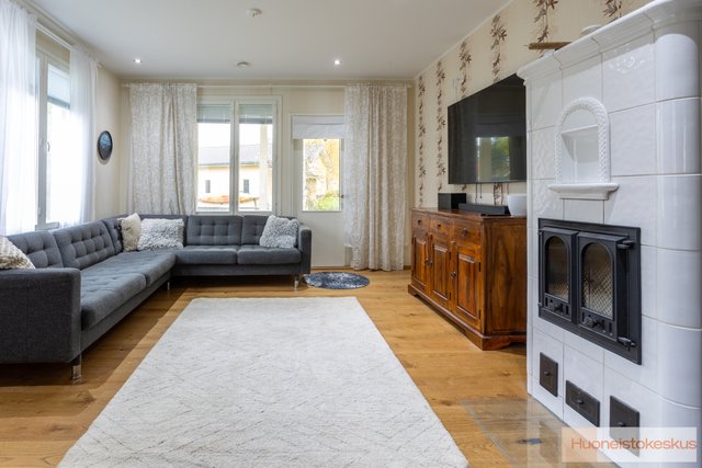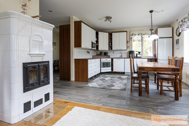 Talon sydämenä toimii avara olohuone, jossa on lämpöä varaava takka, joka luo tunnelmaa ja tuo lisälämpöä kylminä talvi-iltoina. Parketti ja laatoitetut lattiat sekä tapetoidut seinät tuovat tilaan kodikkuutta. Keittiössä on kaikki tarvittavat modernit laitteet, kuten jääkaappi, astianpesukone sekä erillisuuni ja siellä on runsaasti tilaa kokkailuun.