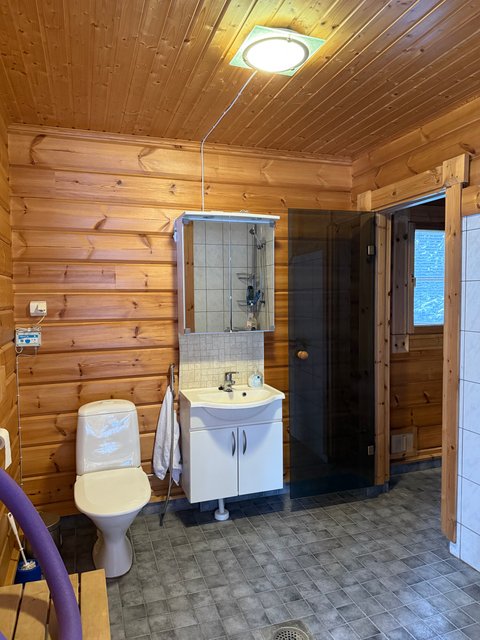 - WC-istuin, suihku, lattialämmitys, pesuallas, allaskaappi, ja peilikaappi