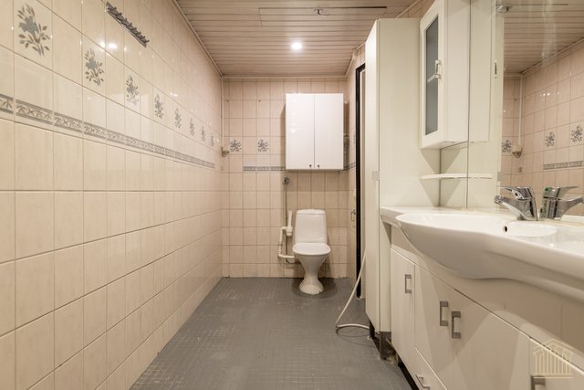 - WC-istuin, suihku, suihkuseinä, pesukoneliitäntä, lattialämmitys (sähköinen), peilikaappi, pesuallas, ja allaskaappi