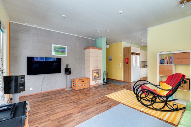 Avara olohuone kutsuu rentoutumaan lämpöä varaavan takan äärellä, olohuoneesta myös käynti ulkoterasille. Hyvinvarusteltu iso keittiö houkuttelee kokkaamaan, tänne mahtuu vaikka koko suku!