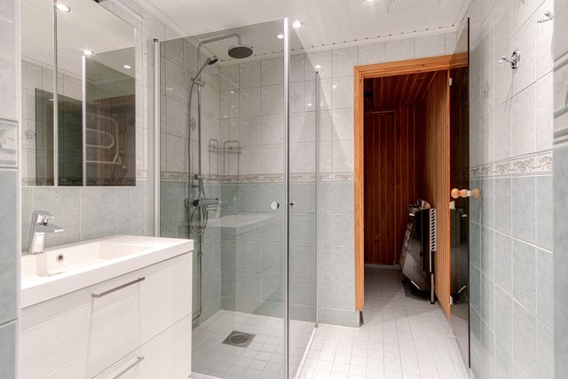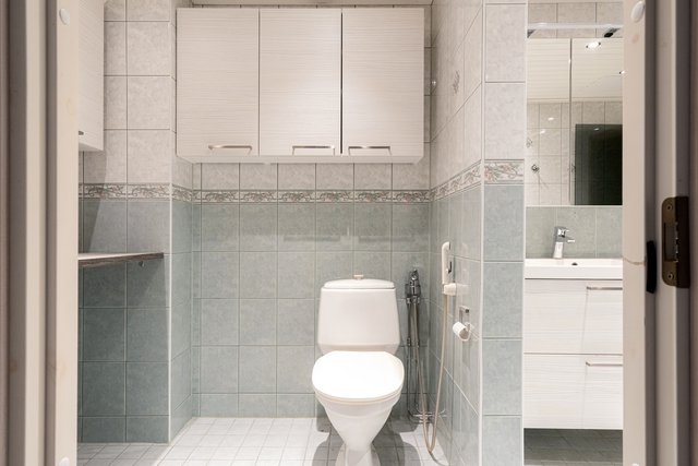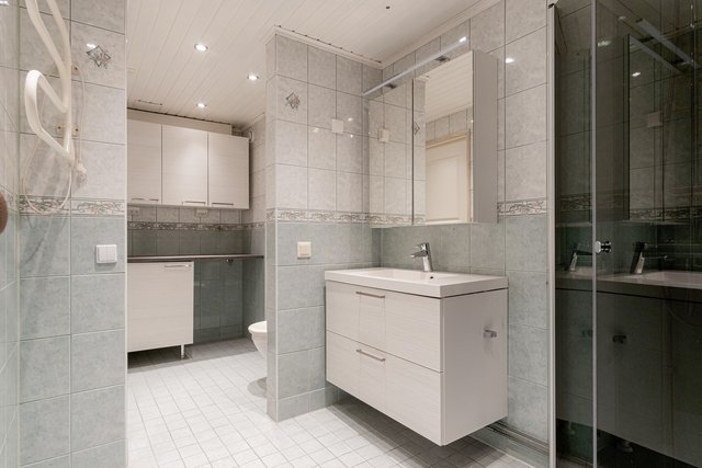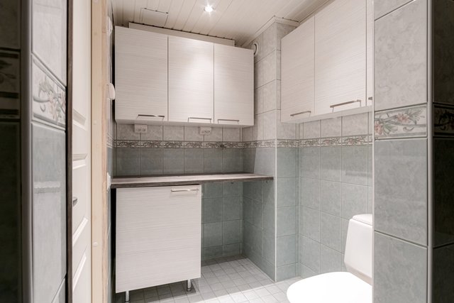 - WC-istuin, suihku, suihkuseinä, pesukoneliitäntä, pesuallas, allaskaappi, peilikaappi, bidee-suihku, rättipatteri ja kiinteitä kaappeja, ja lattialämmitys