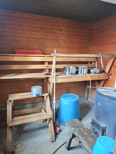 Talon alakerrassa on 64 m² tilaa, ja yläkerrassa noin 20 m², mikä tarjoaa mukavasti tilaa perheelle tai pariskunnalle. Sauna ja pukuhuone lisäävät asumismukavuutta, ja puulämmitteinen kiuas tuo perinteistä saunatunnelmaa.