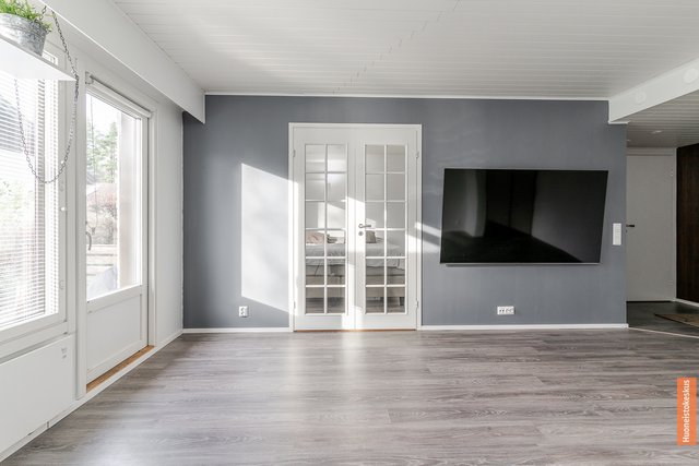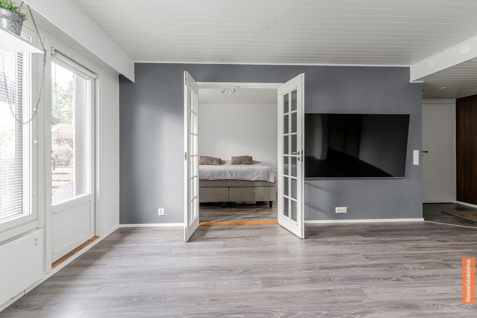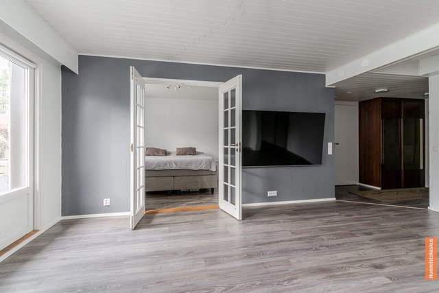 - Tilavasta olohuoneesta kauniit pariovet makuuhuoneeseen sekä kulku omalle, aidatulle pihalle.