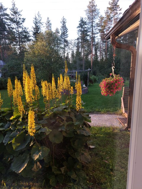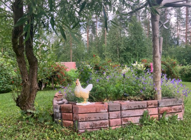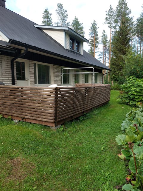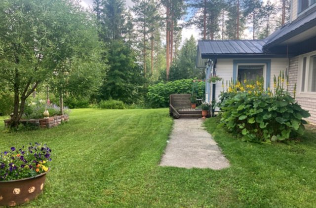 - Talon ympärillä nurmikko, perunamaa ja metsää. Näkymä avautunut järvelle, kun naapurikiinteistön metsää on harvennettu.