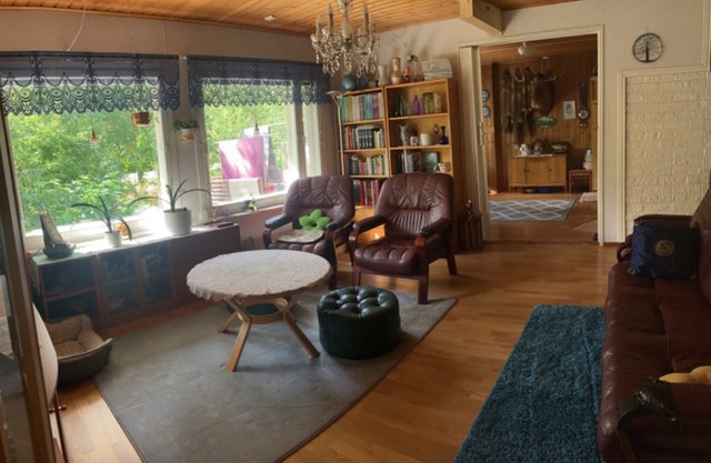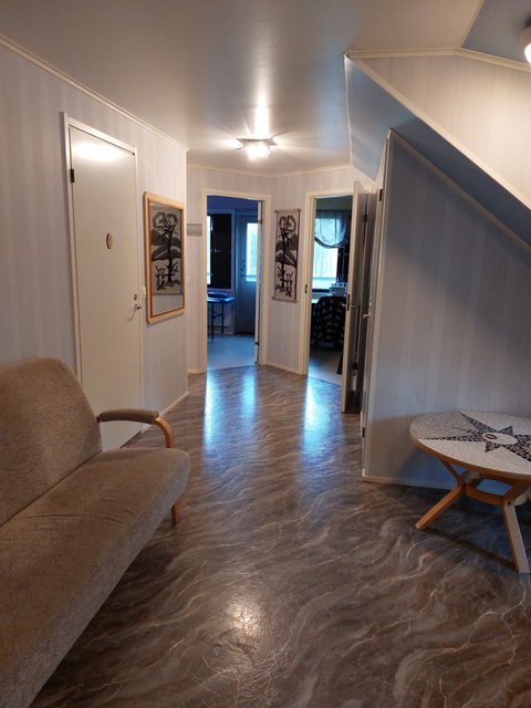 - laminaattia, keittiö ja olohuone ja aula, muovimattoa makuuhuoneet,