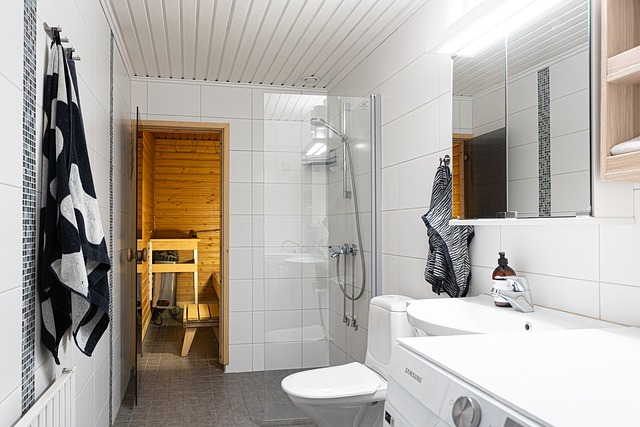 - Suihkuseinä, pesukoneliitäntä, wc-istuin, peilikaappi, suihku, ja kiinteät valaisimet