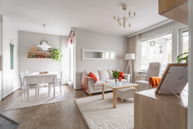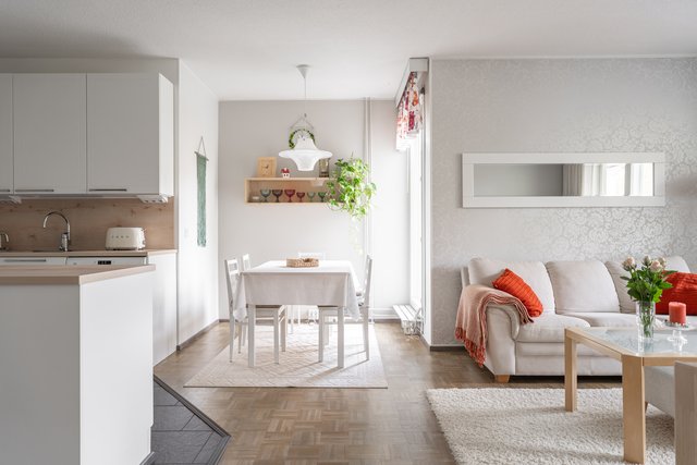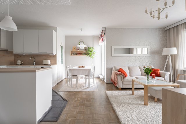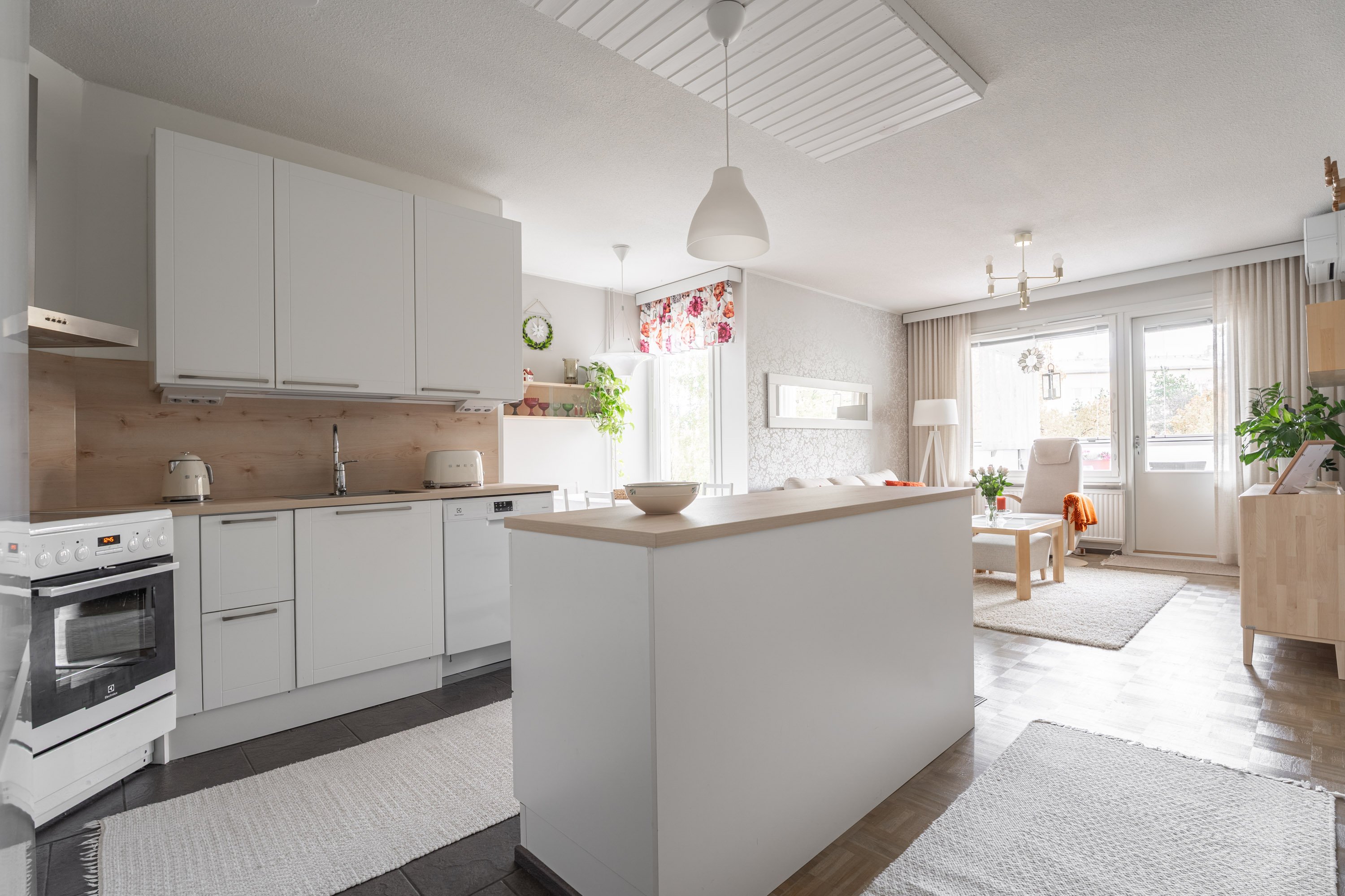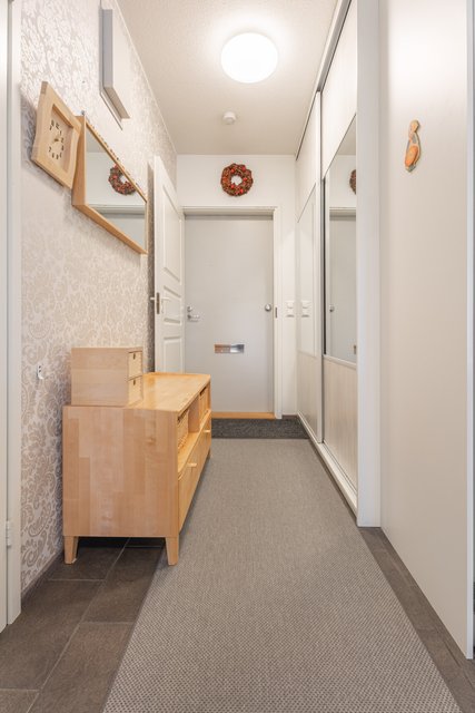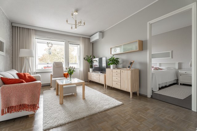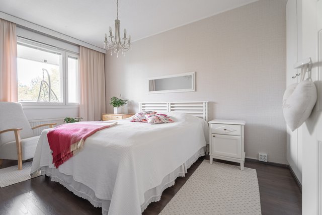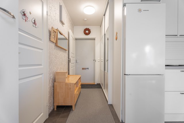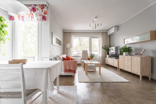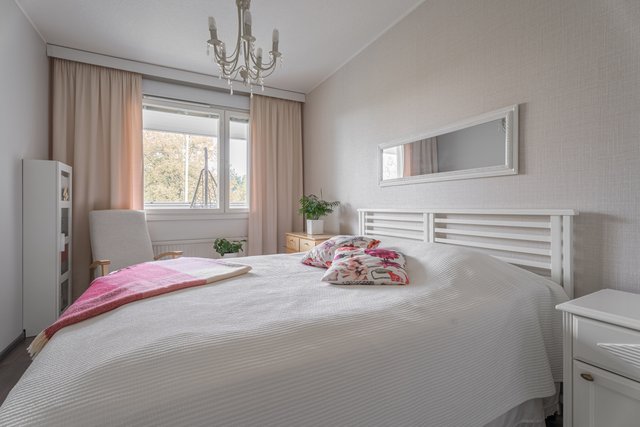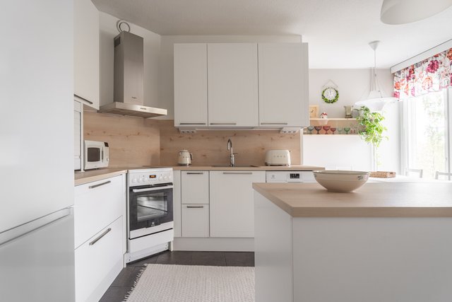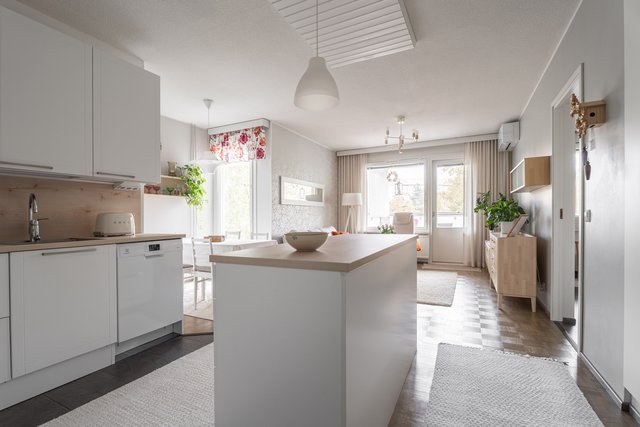 Tästä kodikkaasta kaksiosta on pidetty hyvää huolta ja se on remontoitu kauttaaltaan tähän päivään. Auringon valoa tulvii sisään tuoden kodin vaaleat pinnat kauniisti esille. Keittiö ja olohuone ovat yhtä suurta avaraa tilaa, joten seurustelu on vaivatonta suuremmallakin porukalla. Keittiössä ihastuttaa ennen kaikkea näyttävä saareke, joka kätkee sisäänsä kotikokin aarteet. Aamiaiskaappiin piilotat puolestaan kahvinkeittimen ja leivänpaahtimen, joten tämä sopii vaativammallekin asukkaalle. Ruokailutilan ikkunasta on täydellistä katsoa vuodenaikojen mukaan vaihtuvaa maisemaa.