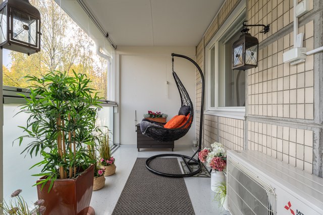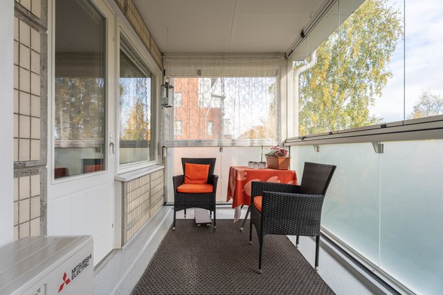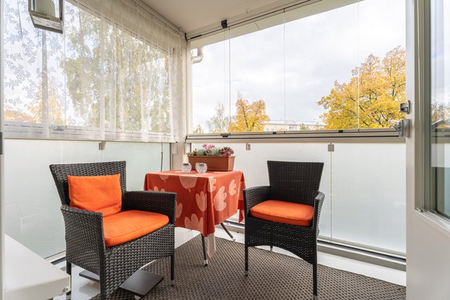 Olohuoneen jatkeena on tilava lasitettu parveke, missä tunnelmoit kynttilän valossa pitkälle syksyyn. Parvekkeella on ihana oma rauhansa, vaikka sijainti onkin keskeinen kodin ollessa lähellä niin keskustaa kuin Ykkösrastin monipuolisia palveluita. Kulttuuripaikoista Musiikkikeskus on vain muutaman minuutin kävelymatkan päässä, samoin kuin Kuopionlahden ja Väinölänniemen upeat lenkkipolut. Järvimaisemissa heitetyn lenkin jälkeen on ihana rentoutua oman saunan löylyissä. Mikäli olet etsinyt muuttovalmista viihtyisää kaksiota keskustan läheisyydestä, kannattaa tulla tutustumaan tähän KOTIIN!