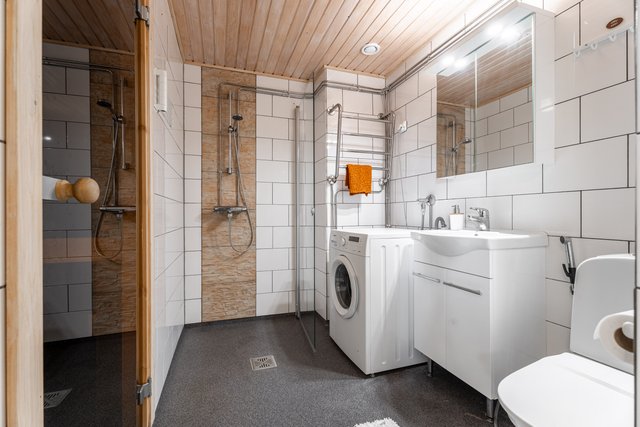 - WC-istuin, suihku, suihkuseinä, pesuallas, peilikaappi, pesukoneliitäntä, ja rättipatteri