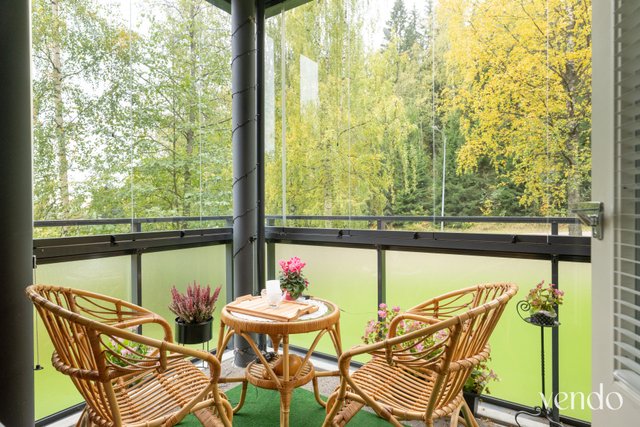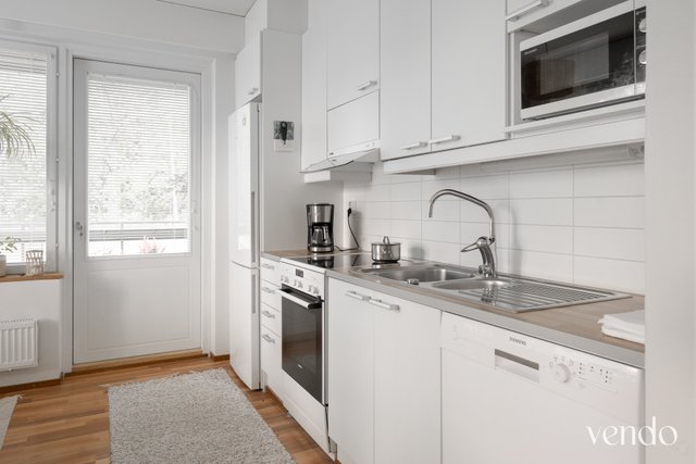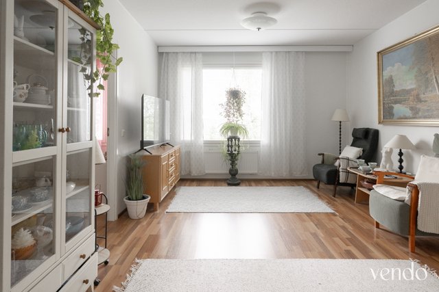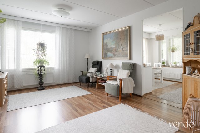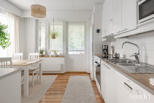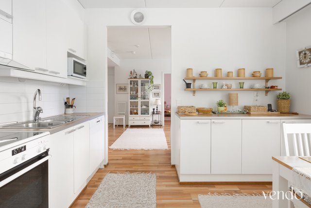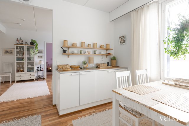 Pohjaratkaisu on toimiva. Erillisessä keittiössä on hyvin työ- ja säilytystilaa ja paikka ruokapöydälle. Täältä on myös käynti hyvän kokoiselle lasitetulle parvekkeelle. Olohuoneessa viihtyy isommallakin porukalla, eikä mikään muukaan tila tunnu ahtaalta. Säilytystilaa on hyvin kaapistoissa ja makuuhuoneen yhteydessä olevassa vaatehuoneessa.