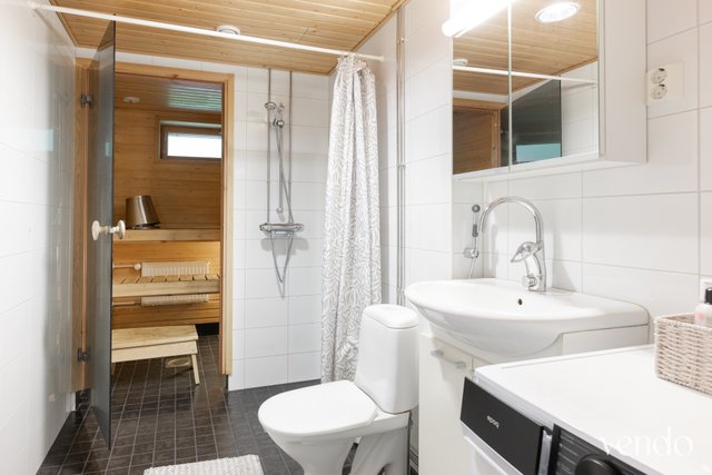 - WC-istuin, suihku, pesukoneliitäntä, peilikaappi, allaskaappi, ja bidee-suihku