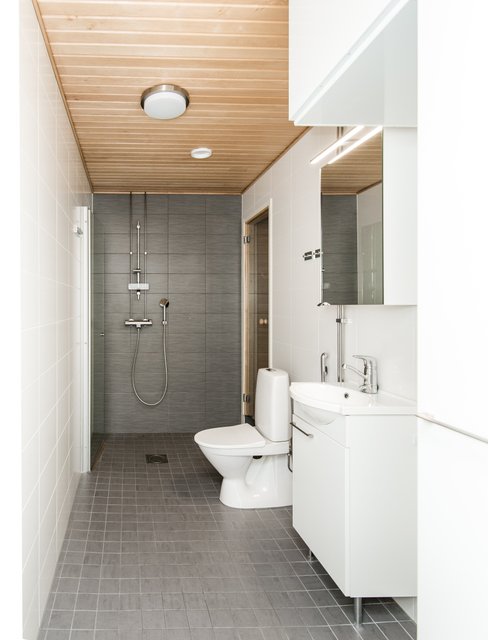- WC-istuin, suihku, suihkuseinä, pesukoneliitäntä, lattialämmitys, peilikaappi, pesuallas, allaskaappi, ja bidee-suihku