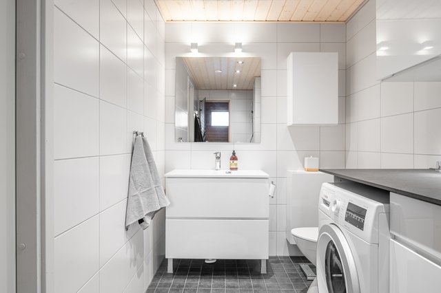 - WC-istuin, suihku, lattialämmitys, pesukoneliitäntä, pesuallas, peilikaappi, ja allaskaappi
