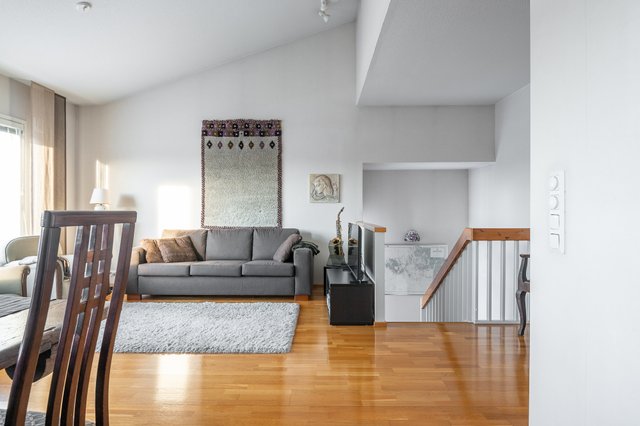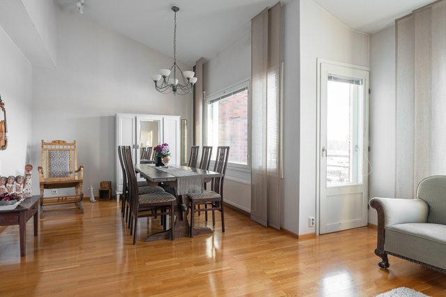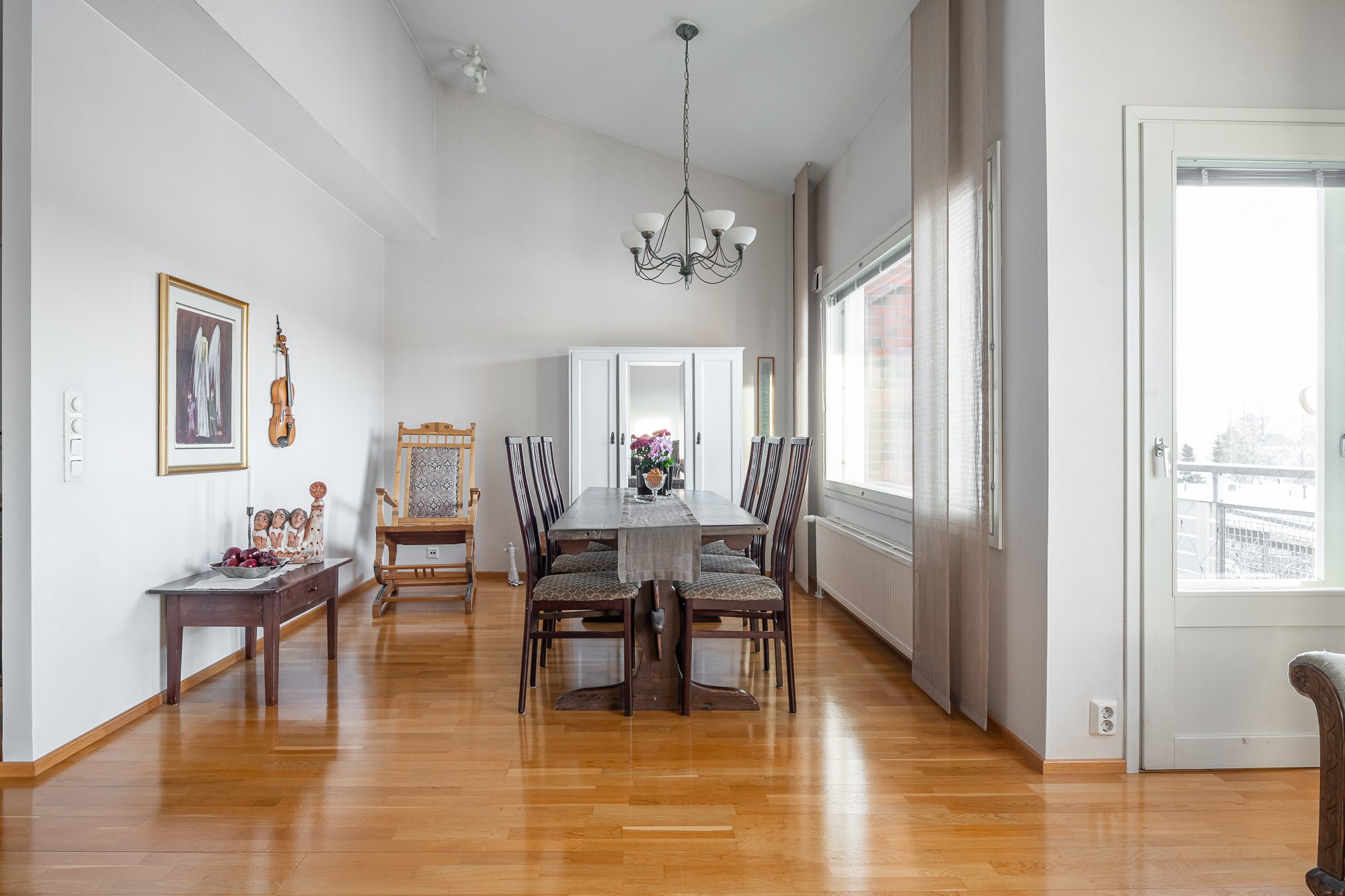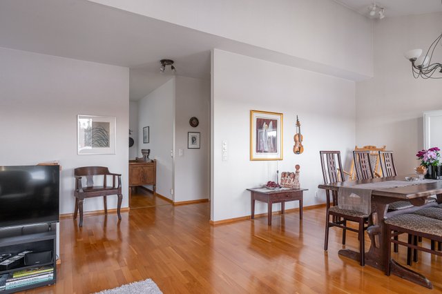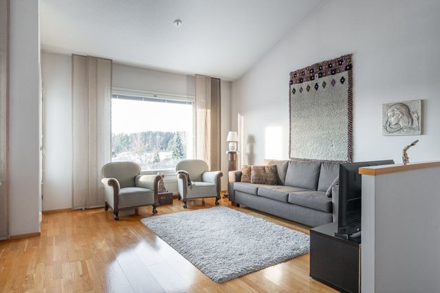 - Iso ja valoisa olohuone ruokailutilan yhteydessä. Olohuoneessa korkea vino sisäkatto.