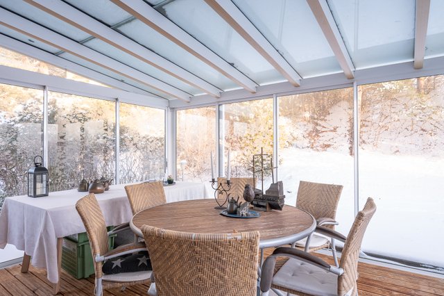 - Lumonin lasitettu 16 m2 terassi, kulku keittiöstä. Terassilaudoitusta myös lasitetun osan ulkopuolella, kesäkuvia saatavilla välittäjältä, joista näkyy takapihan terassi ja nurmialueet kokonaisuudessaan.