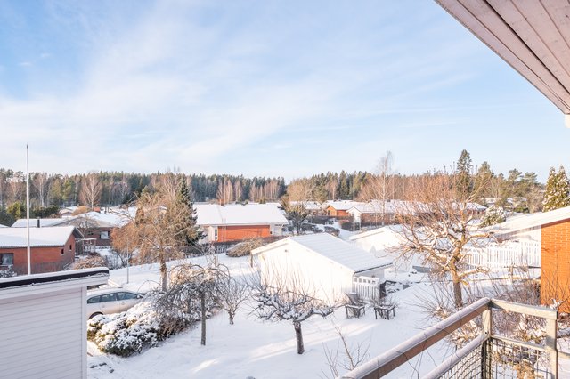 Yläkertaan tultaessa tilan tunne ja avaruus korostuvat entisestään. Siellä sijaitsevat kodin keittiö, valoisa olohuone- ja ruokailutila, makuuhuone sekä erillinen WC. Täällä tyylikkyyttä ja avaruutta korostaa olohuone- ja ruokailutilan korkea vino sisäkatto. Ulkotilat ovat myös luonteva osa tätä kotia, olohuoneesta on kulku kodin parvekkeelle, josta on näkymä etupihalle ja keittiöstä puolestaan takapihan puolelle lasitetulle 16 m2 lasiterassille. Takapihalla terassilaudoitusta on lasituksen ympärillä lisää ja takapiha on suojaisa.