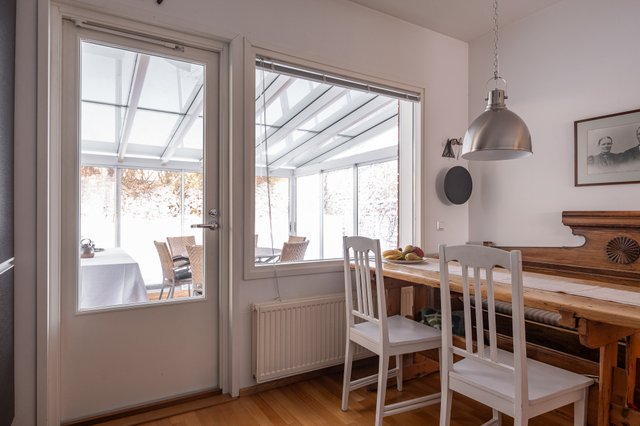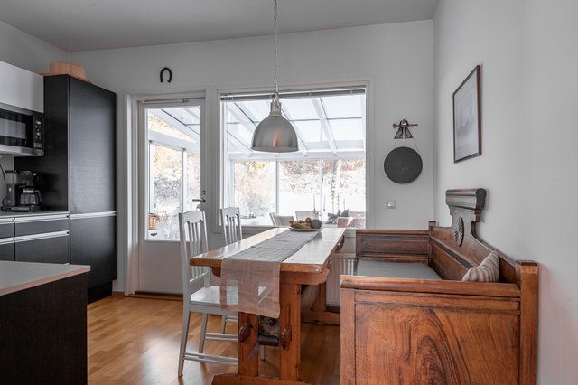 - Iso keittiö integroiduilla kodinkoneilla, reilusti kaappi- ja laskutilaa, ruokapöytä mahtuu hyvin ikkunan eteen. Keittiöstä kulku lasitetulle terassille ja takapihalle.