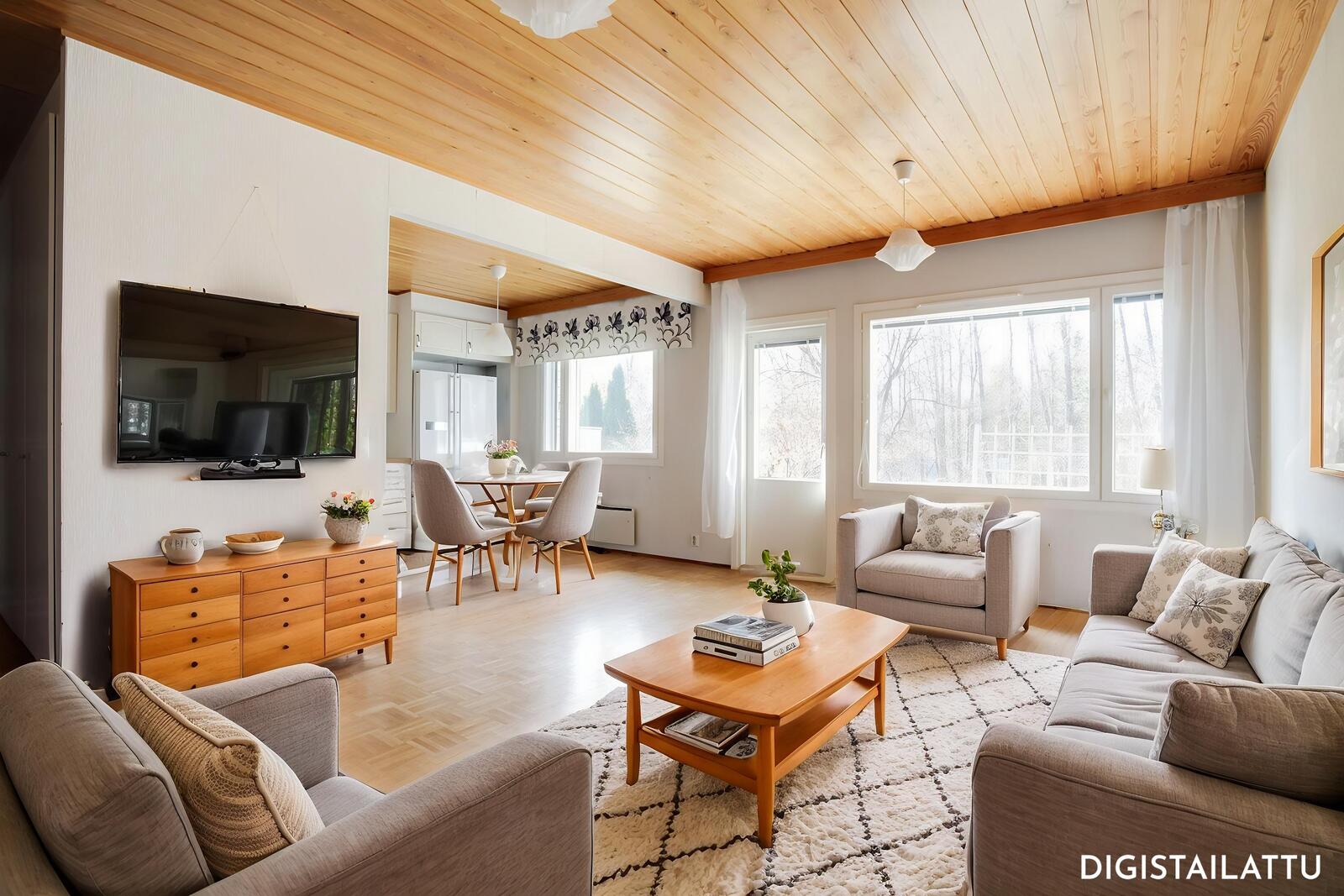 Asunto tuntuu todella tilavalta ja siinä on erinomainen pohjaratkaisu. Suuresta olohuoneesta avautuu ovi aurinkoiselle päätypihalle eikä taloja ole siellä vastassa. Saat olla hyvin rauhassa siis. Keittiö yhdistyy kauniisti olohuoneeseen tuoden lisää avaruutta. Asunnossa on myös hyvänkokoinen kylpyhuone ja sauna. Lisäksi löytyy erillinen wc ja kaksi makuuhuonetta sisääntulokerroksesta.