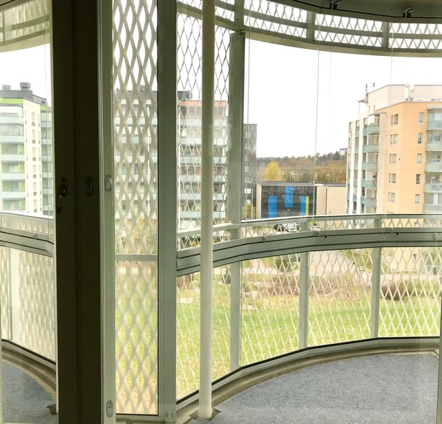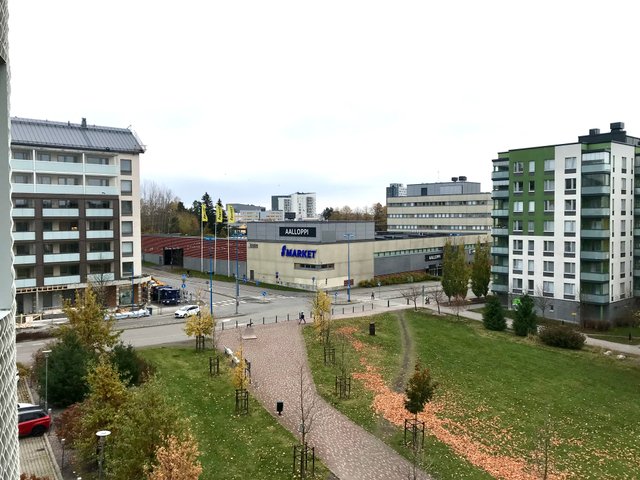 - 5. kerroksen avarat näkymät lasitetulta parvekkeelta ja asunnon ikkunoista länteen ja pohjoiseen.