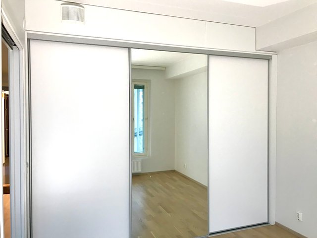 - Hyväkuntoinen makuuhuone, jossa liukuovikaapisto. Joitakin ruuvinreikiä on kitattu umpeen, mutta seinäpintoja ei ole hoitomaalattu.
