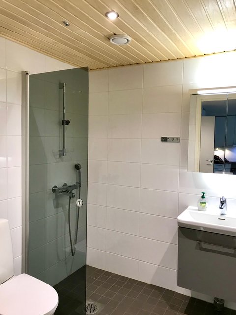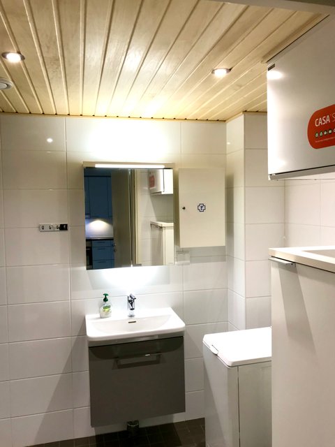 - Hyväkuntoinen pesutila/wc. Pesutila/wc-tilassa on myyjän pyykinpesukone, jonka myyjä mielellään myy edullisesti ostajalle. Kalusteet: Allaskaluste, Peilikaappi, Pyykkikaappi, Allashana Suihkuhana ja -setti, WC-istuin, Tukikahva, Pesukoneliitännät, Lääkekaappi. Varusteet: Suihkuseinä, Pyyhekoukut, WC- paperiteline, Lattiakaivon kansi, Yleisvalaistus, Sähköinen mukavuuslattialämmitys. Seinämateriaalit: Kaakelia. Lattiamateriaalit: Laattaa. Sisäkatto: Haapapaneelia.