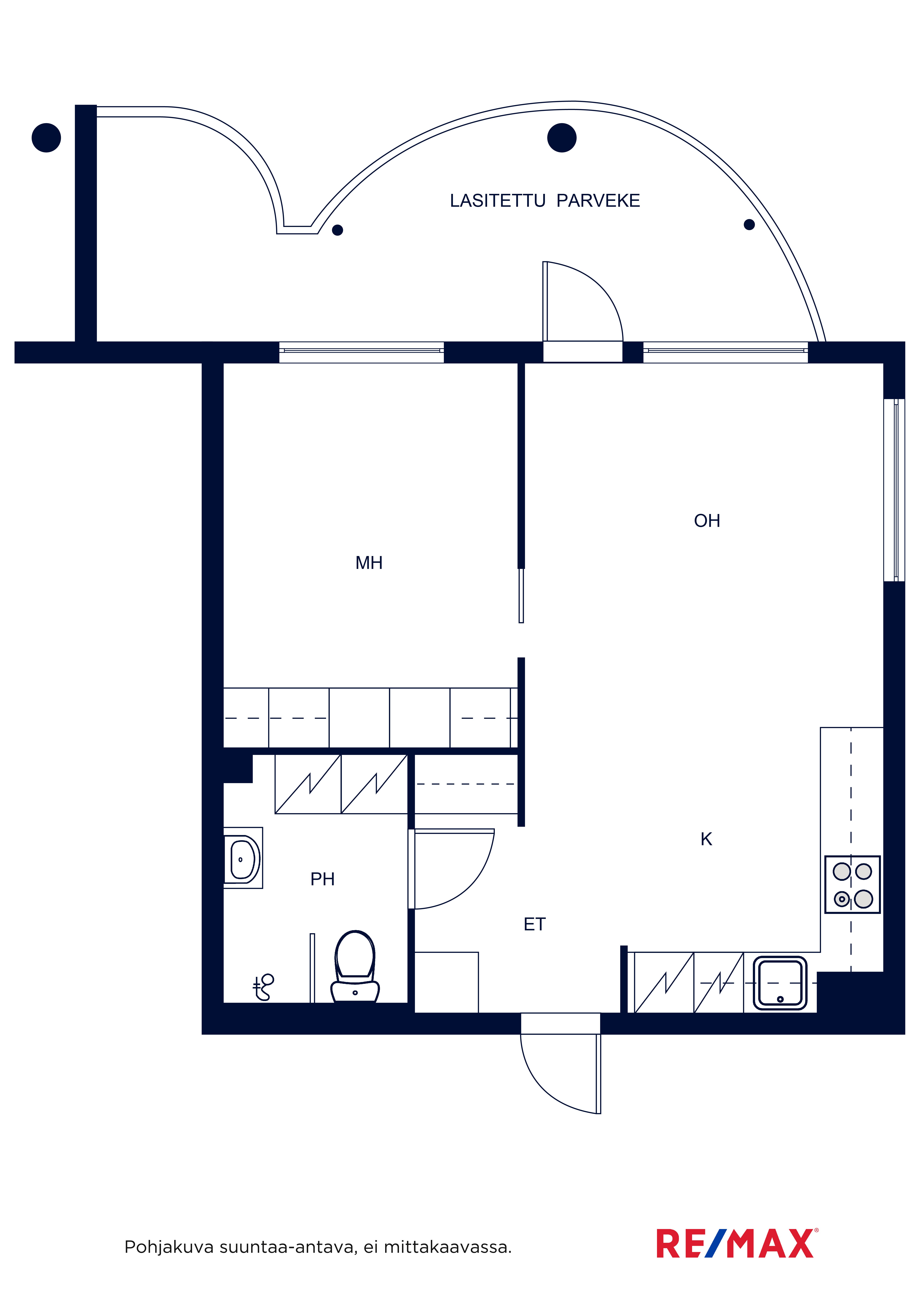 Huoneistoselitelmä: Kaksio, jossa olohuone-avokeittiö-eteistilayhdistelmä, makuuhuone, pesutila/wc, lasitettu parveke. Yhtiöjärjestyksen mukaan; 2h+kt. Eteisessä ja makuuhuoneessa liukuovikaapistot. Pesutila/wc-tilassa sähköinen mukavuuslattialämmitys.
