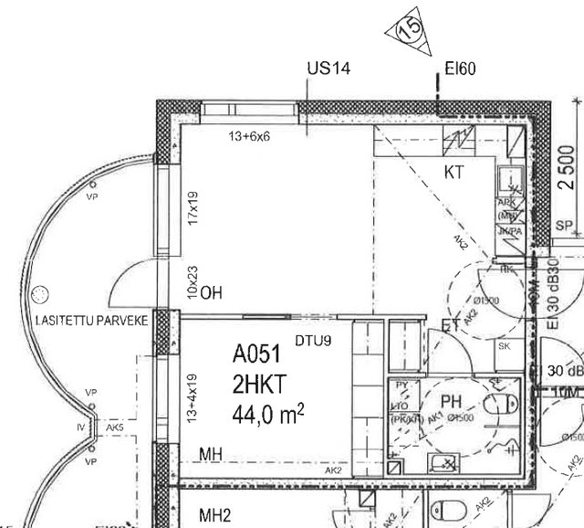 Kaksio: Asuinhuone-avokeittiö-eteistilayhdistelmä, makuuhuone, pesutila/wc, lasitettu parveke