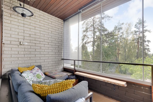 Asunnon etelään avautuvalta lasitetulta parvekkeelta voit nauttia auringonpaisteesta ja omasta rauhasta. Takapihalta löytyy rauhallinen metsämaisema.