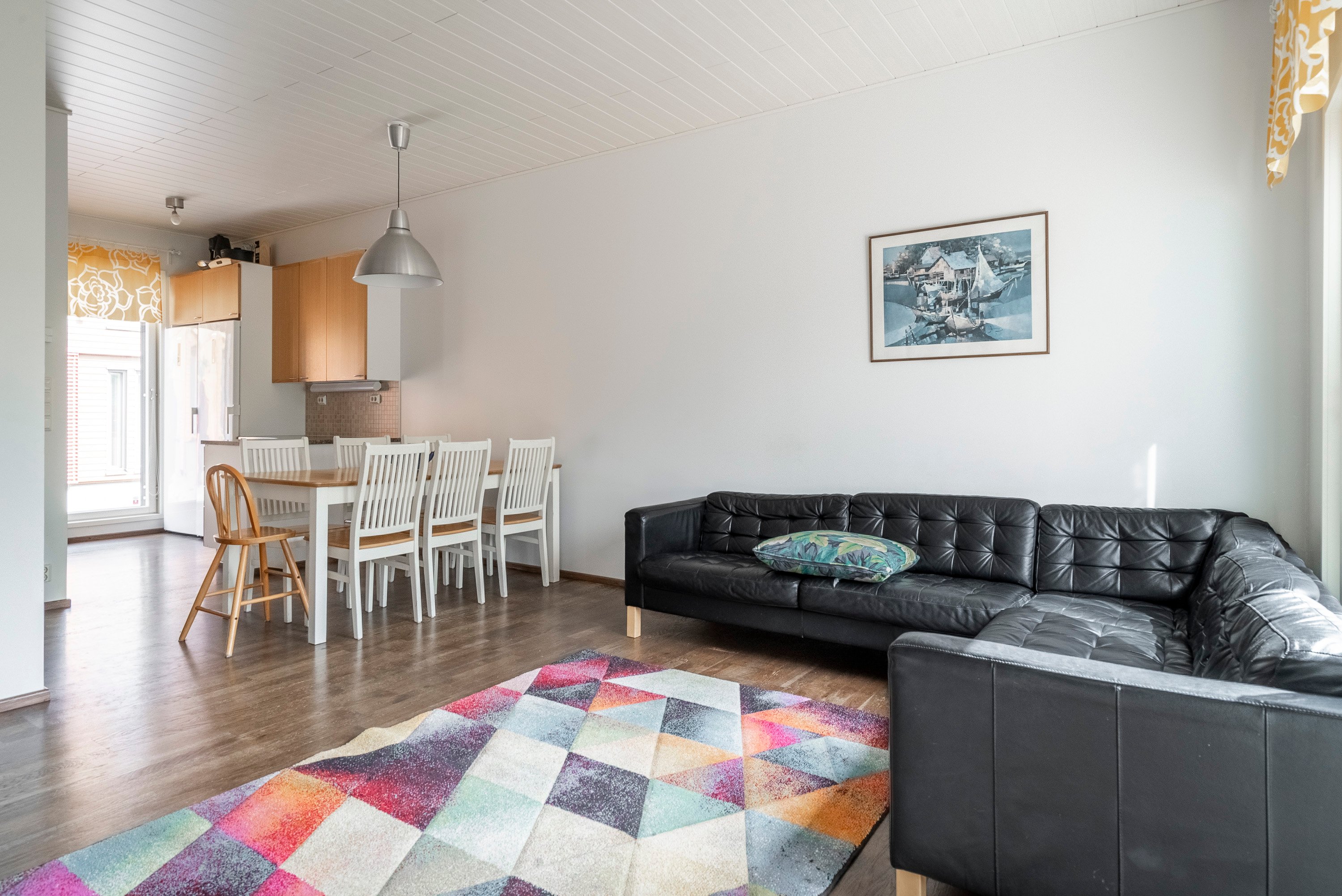 - Jääkaappi ja pakastin (2020), liesi (keraaminen), astianpesukone (2024), liesituuletin (hormi). Työtaso laminaattia, kaapistojen välitila laattaa. Seinät maalattu, lattia parkettia. Ruokailutila keittiön ja olohuoneen välissä, tilaan mahtuu pitkä pöytä.
