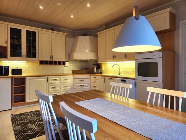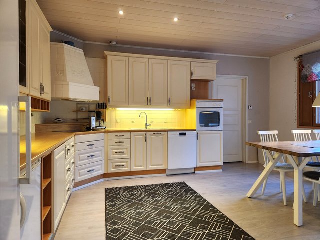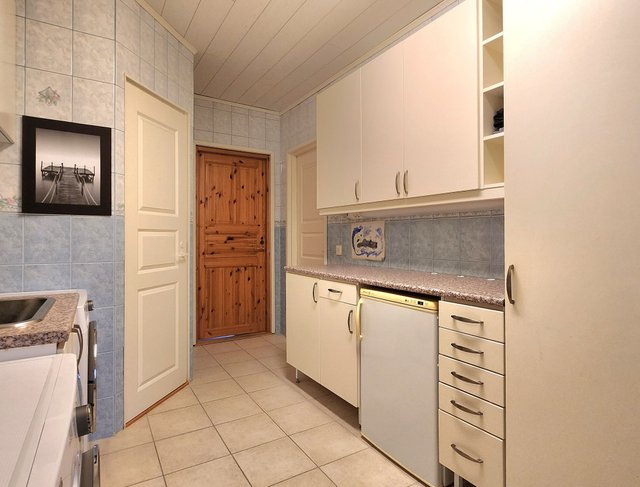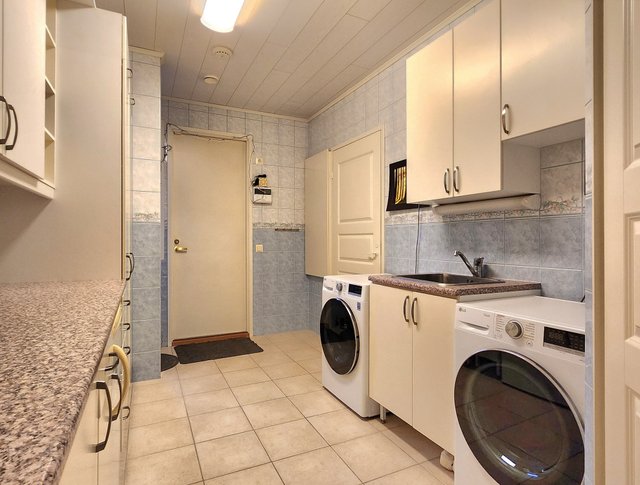 - Pesukone, pesukoneliitäntä, pesuallas, pyykkikaapit, kurapiste, lattialämmitys, pöytätaso, ja kuivausrumpu