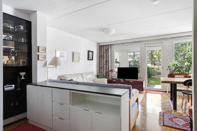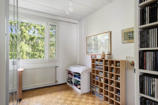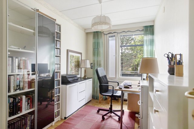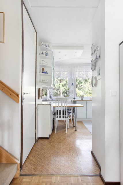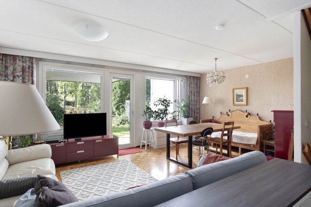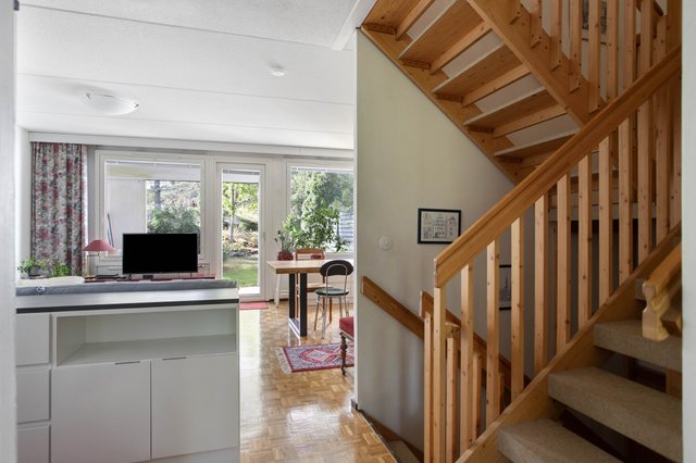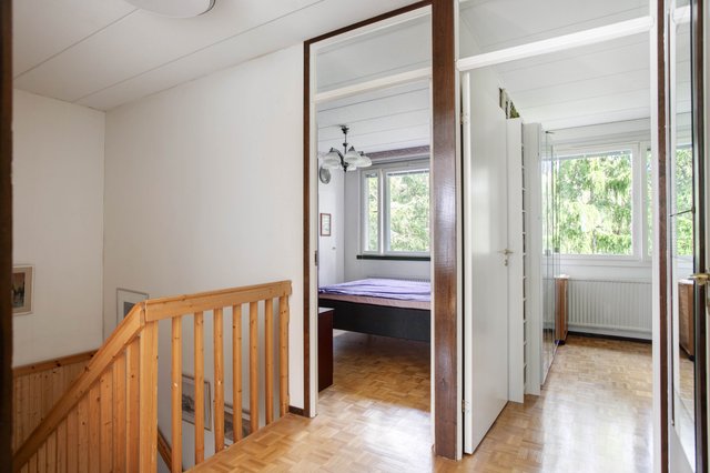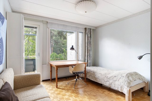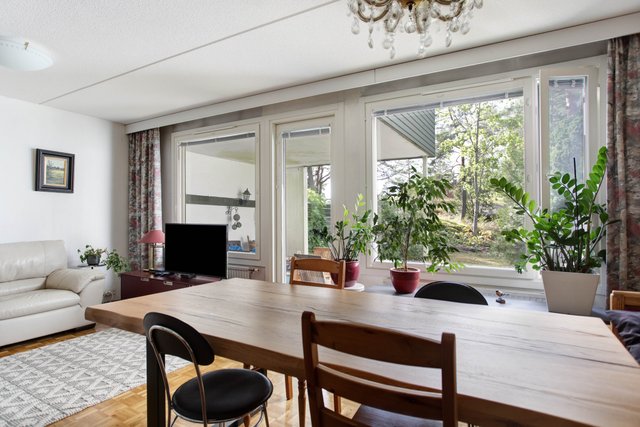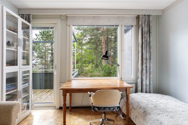 valoisa olohuone, josta on käynti etelä ja ilta-auringon puolella sijaitsevalle suojaisalle takapihalle. Vehreä ja kallioinen takapiha tarjoaa yksityisyyttä ja viihtyisän ympäristön oleskeluun. Neljä makuuhuonetta vessoineen ja parvekkeineen sijaitsee omassa kerroksessaan. Huoneisto tarjoaa remonttimahdollisuuden - luo aivan omaan makuusi sopiva tyylikoti. Lämmin autotalli (n. 12 m2) aivan pääsisäänkäynnin vieressä antaa mahdollisuuden monipuolisen mahdollisuuden harrastajille.