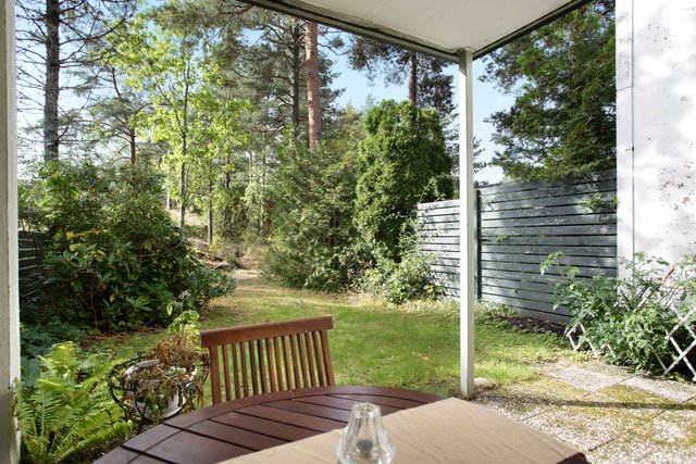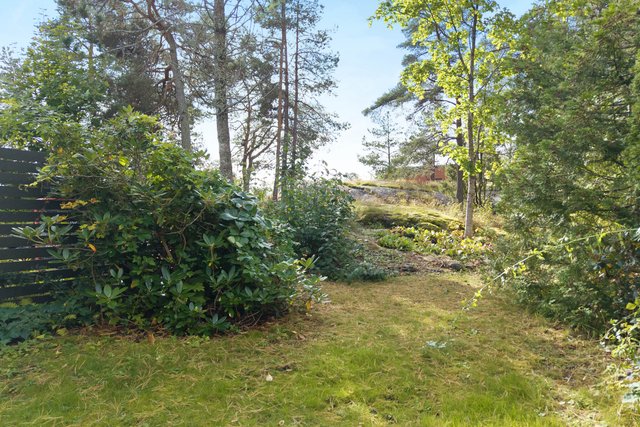- Vehreä ja kallioinen takapiha, jonne paistaa ilta-aurinko.