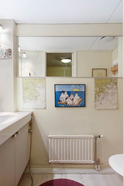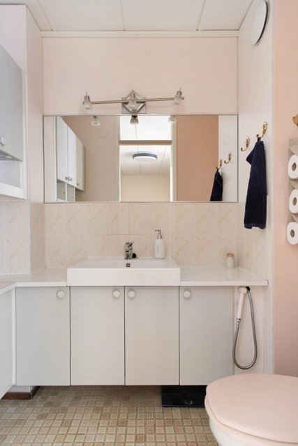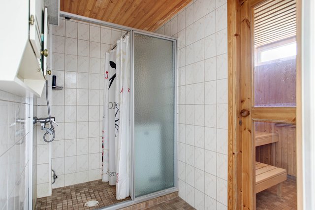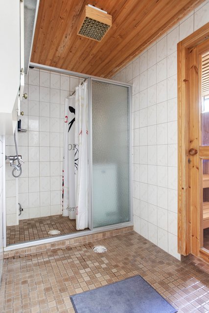 - Ylimmän kerroksen vessan lattia on laatoitettu ja alimman kerroksen vessan lattiassa on muovimatto