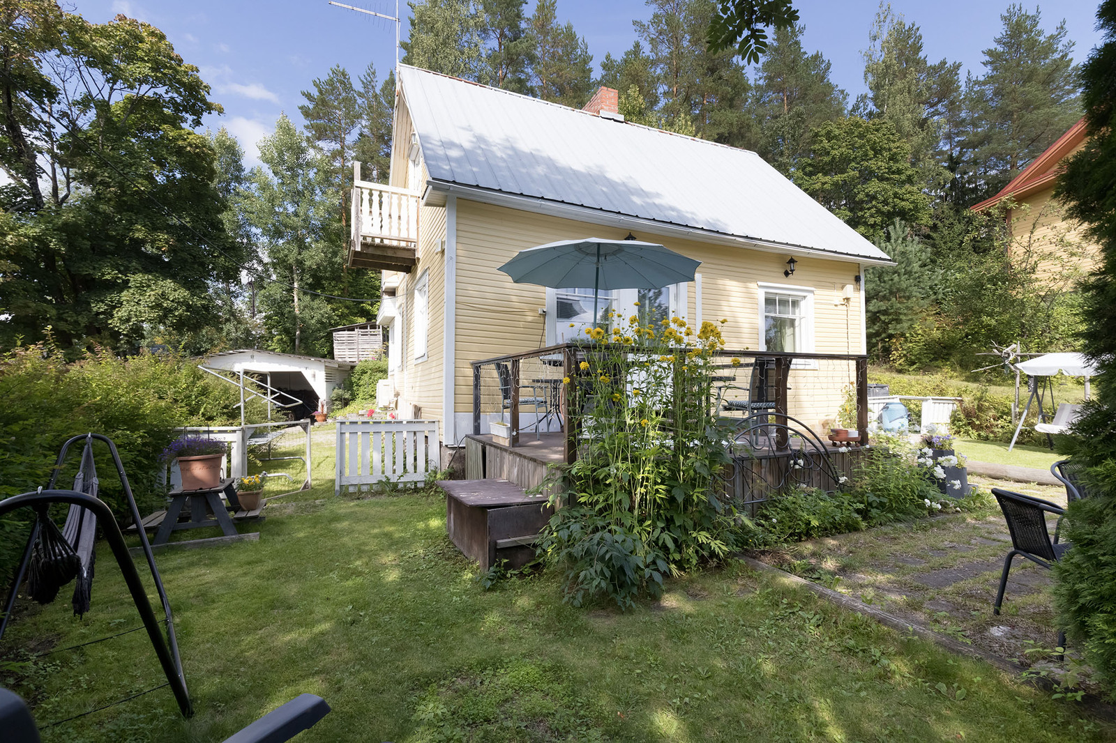 Tontilla on erillinen saunarakennus, joka tarjoaa mahdollisuuden rentoutua omassa rauhassa. Saunan edustalla on terassi, jolta avautuu näkymä kauniille pihalle – täydellinen paikka vilvoitella ja nauttia rauhallisista hetkistä.