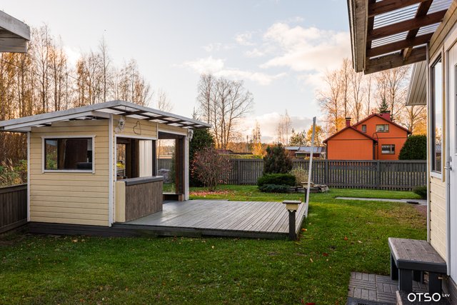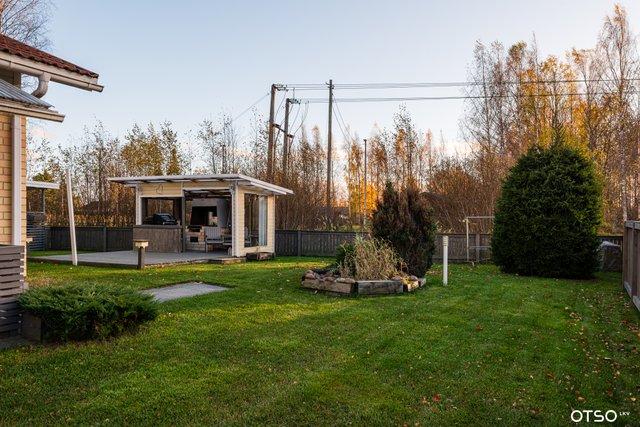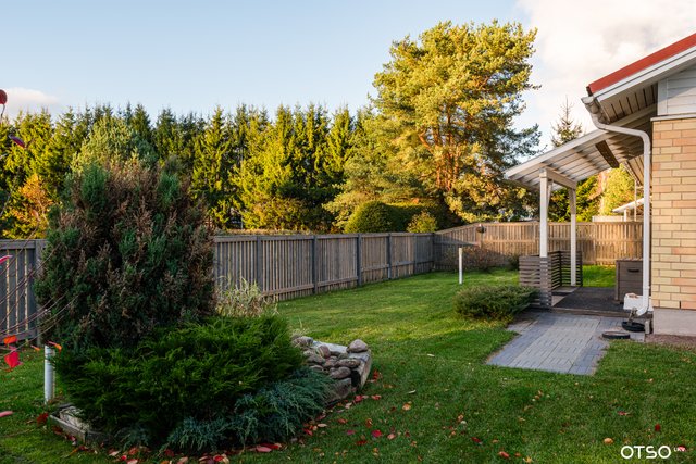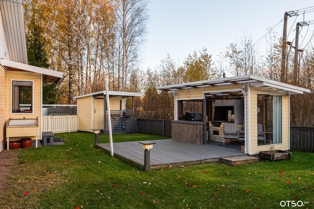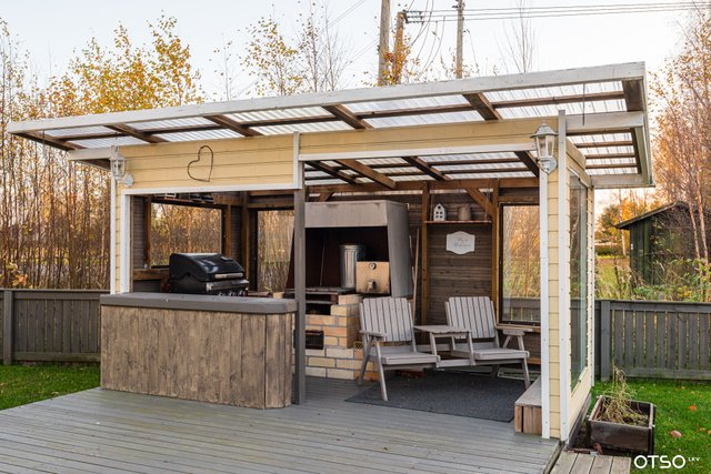 Suojaisa ja aidattu piha grillikatoksella, luo viihtyisän ympäristön kesäisiin hetkiin perheen tai ystävien kesken.