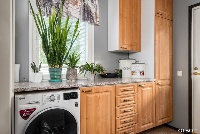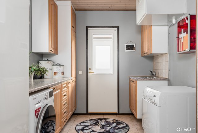 - Pesukoneliitäntä, lattialämmitys, pesuallas, lattiakaivo, silityspöytä/taso, pyykkikaapit, ja pöytätaso