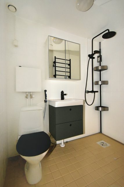 - WC-istuin, suihku, peilikaappi, pesukoneliitäntä, allaskaappi, bidee-suihku, ja pesuallas