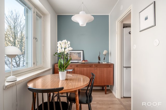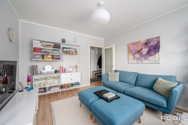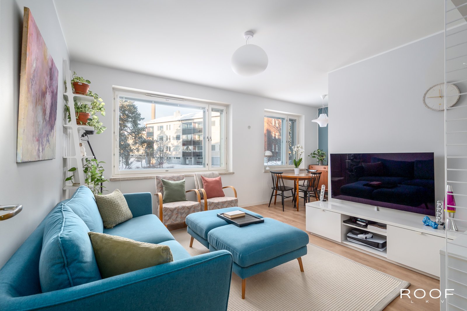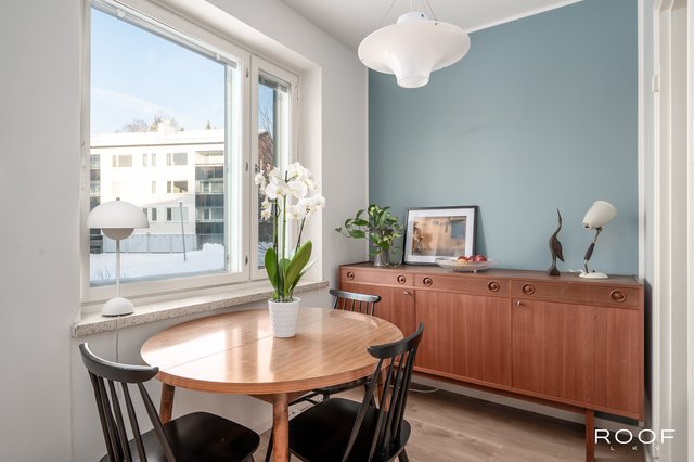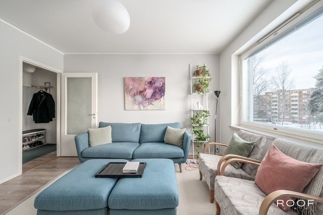 Olohuone muodostaa kodin keskuksen ja tarjoaa hyvin tilaa sekä sohvaryhmälle että oleskelulle. Tilaan yhdistyy ruokailutila, jonka äärellä on mukava viettää aikaa niin arkena kuin viikonloppuisin. Keittokomero on omana, selkeästi rajattuna tilanaan, ja siinä on hyvin kaappi- ja laskutilaa. Vaalea yleisilme tekee keittiöstä raikkaan ja ajattoman.