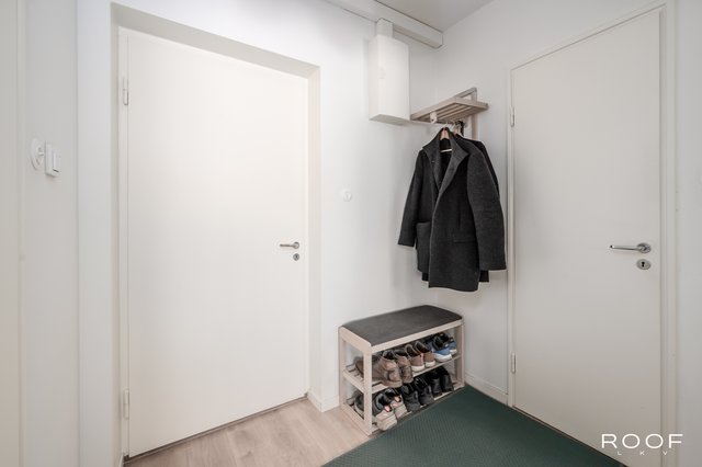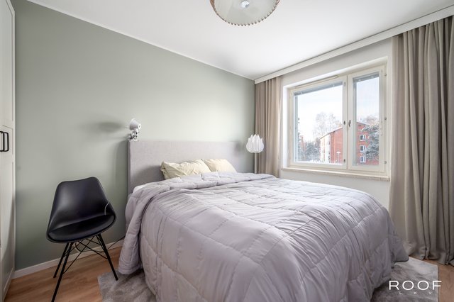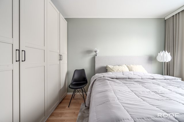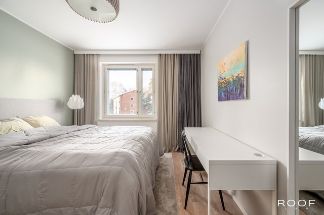 Makuuhuone on rauhallinen ja helposti kalustettava - tilaan mahtuu hyvin parisänky, ja säilytystilat tukevat arjen toimivuutta. Kylpyhuone on siisti ja käytännöllinen, ja siellä on myös paikka pyykkihuollolle.